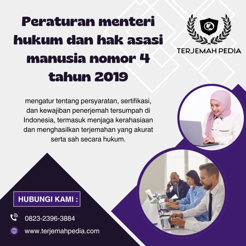 Peraturan Menteri Hukum dan Hak Asasi Manusia Nomor 4 Tahun 2019 mengatur tentang penerjemah tersumpah yang berfungsi untuk memastikan kualitas dan keabsahan terjemahan dokumen yang diperlukan dalam proses hukum, administrasi, dan imigrasi. Peraturan ini menetapkan prosedur yang harus diikuti oleh penerjemah dalam melaksanakan tugas mereka, serta hak dan kewajiban yang dimiliki oleh penerjemah tersumpah.